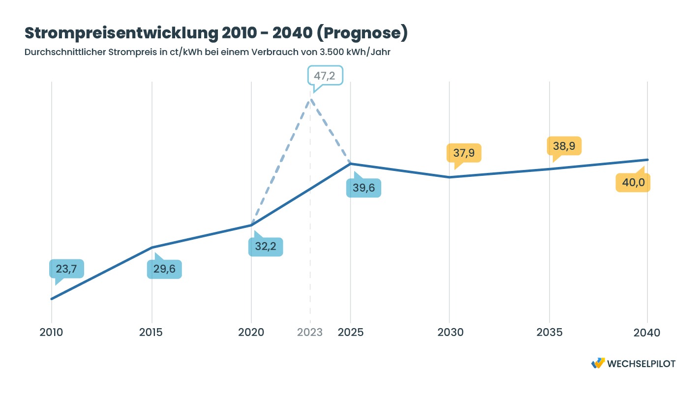 Aus einer Wirtschaftlichkeitsberechnung zur Novelle des Gebäudeenergiegesetzes vom Juni 2023, die das Bundesministerium für Wirtschaft und Klimaschutz in Auftrag gegeben hat, geht hervor, dass der Strompreis in den Jahren bis 2026 zunächst fallen werden. Eine Prognose aus dem Jahr 2024 geht für 2040 von einem Strompreis von 40 ct/kWh aus, was bedeuten würde, dass die Strompreise stabil bleiben. Andere Quellen äußern jedoch andere Einschätzungen von weit höheren Strompreisen, mit Zahlen von bis zu 70 ct/kWh.