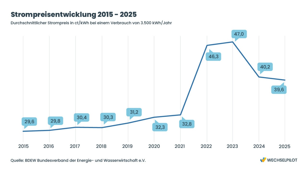 - Im Jahr der Strommarktliberalisierung 1998 zahlten Verbraucher 17,11 ct/kWh für Strom, 2025 sind es 39,6 ct/kWh. Bei einem durchschnittlichen Jahresverbrauch von 3.500 kWh entspricht das einer Steigerung von 131 %.